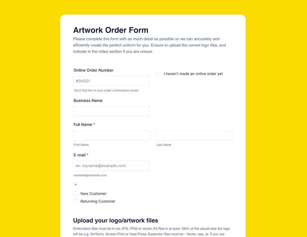 Use the 'Add Artwork' menu on each product page to select the type of artwork you'd like on your uniforms. If you don't see an option that suits you contact us, or write in the order notes for us to follow up.