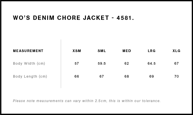AS ColourWomens Denim Chore Jacket (AS-4581) Product formSKU: 4581-M_BLU-F-XS $73.95 Excl. GST ColourMid Blue / XSM Free pickup in our shop(s) Ecru / XSM Ecru / SML Ecru / MED Ecru / LRG Ecru / XLG Mid Blue / XSM Mid Blue / SML Mid Blue / MED Mid Blue / LRG Mid Blue / XLG Free pickup in our shop(s) ColourMid Blue Free pickup in our shop(s) Ecru Mid Blue Size Free pickup in our shop(s) XSM SML MED LRG XLG
