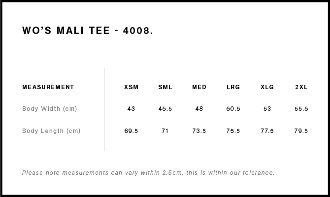 AS ColourWomens Mali T-Shirt (AS-4008) Product formSKU: 4008-INDGO-F-XS $14.95 Excl. GST ColourIndigo / XSM Free pickup in our shop(s) Army / XSM Army / SML Army / MED Army / LRG Army / XLG Black / XSM Black / SML Black / MED Black / LRG Black / XLG Black / 2XL Navy / XSM Navy / SML Navy / MED Navy / LRG Navy / XLG Navy / 2XL Coal / XSM Coal / SML Coal / MED Coal / LRG Coal / XLG Grey Marle / XSM Grey Marle / SML Grey Marle / MED Grey Marle / LRG Grey Marle / XLG Grey Marle / 2XL Indigo / XSM Indigo / SML Indigo / MED Indigo / LRG Indigo / XLG White / XSM White / SML White / MED White / LRG White / XLG White / 2XL Mauve / XSM Mauve / SML Mauve / MED Mauve / LRG Mauve / XLG Light Blue Marle / XSM Light Blue Marle / SML Light Blue Marle / MED Light Blue Marle / LRG Light Blue Marle / XLG Pale Pink / XSM Pale Pink / SML Pale Pink / MED Pale Pink / LRG Pale Pink / XLG Sage / XSM Sage / SML Sage / MED Sage / LRG Sage / XLG Burgundy / XSM Burgundy / SML Burgundy / MED Burgundy / LRG Burgundy / XLG Rose / XSM Rose / SML Rose / MED Rose / LRG Rose / XLG Oatmeal Marle / XSM Oatmeal Marle / SML Oatmeal Marle / MED Oatmeal Marle / LRG Oatmeal Marle / XLG Free pickup in our shop(s) ColourIndigo Free pickup in our shop(s) Army Black Navy Coal Grey Marle Indigo White Mauve Light Blue Marle Pale Pink Sage Burgundy Rose Oatmeal Marle Size Free pickup in our shop(s) XSM SML MED LRG XLG 2XL